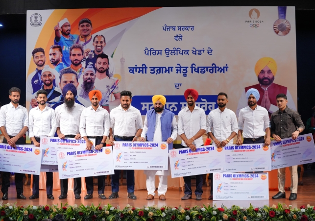 पंजाब के मुख्यमंत्री भगवंत सिंह मान ने हाल ही में समाप्त हुए पेरिस ओलंपिक में कांस्य पदक जीतने वाली भारतीय हॉकी टीम के पंजाबी खिलाड़ियों को एक-एक करोड़ रुपए के नकद इनाम से सम्मानित किया।