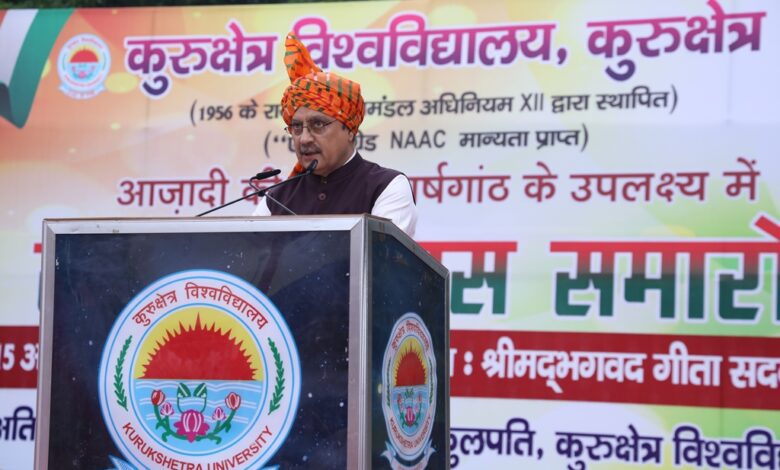 कुरुक्षेत्र, 15 अगस्त। कुरुक्षेत्र विश्वविद्यालय के कुलपति प्रो. सोमनाथ सचदेवा ने आजादी की 78वीं वर्षगांठ के अन्तर्गत स्वतंत्रता दिवस पर कुरुक्षेत्र विश्वविद्यालय के श्रीमद्भगवद्गीता सदन में राष्ट्रीय ध्वजारोहण किया व एनसीसी परेड की सलामी लेकर शहीदों को नमन किया। इस मौके पर विश्वविद्यालय के संगीत एवं नृत्य विभाग, आईआईएचएस, यूटीडी व यूनिवर्सिटी सीनियर सेकेंडरी मॉडल स्कूल के विद्यार्थियों ने देशभक्ति से ओतप्रोत कार्यक्रम प्रस्तुत किए।