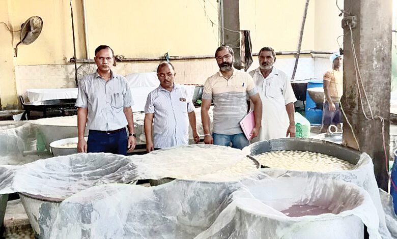 तलवाड़ा-कमिश्नर खाद्य एवं ड्रग एडमनिस्ट्रेशन डॉ. अभिनव त्रिखा और सिविल सर्जन होशियारपुर डॉ. पवन कुमार शगोत्रा के निर्देशानुसार जिला स्वास्थ्य अधिकारी डॉ. जतिंदर भाटिया और खाद्य सुरक्षा अधिकारी मुनीश सोढ़ी और उनकी टीम ने मुकेरियां और हाजीपुर में मिठाई की दुकानों पर छापेमारी की। जिले में लोगों को साफ-सुथरा और गुणवत्तापूर्ण खाना मुहैया करवाना की जिम्मेदारी है। जिसके तहत होशियारपुर जिले के अलग-अलग हिस्सों में खाद्य सुरक्षा टीम द्वारा लगातार छापेमारी की जा रही है। मुकेरिया में मिठाई के कारखाने की चेकिंग की गई। स्वास्थ्य विभाग ने घटिया मिठाइयों को मौके पर ही नष्ट करवा दिया और तीन सैंपल भी लिए गए। सैंपलों को जांच के लिए फूड लैब खरड़ भेज दिया गया है और रिपोर्ट आने के बाद आगे की कार्रवाई की जाएगी। फैक्ट्री मालिक को ताडऩा लगाई गई है और सुधार नोटिस भी जारी किया गया है।