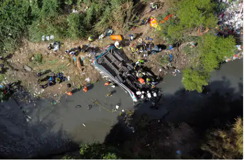 ग्वाटेमाला सिटी–मध्य अमेरिका में स्थित ग्वाटेमाला देश की राजधानी ग्वाटेमाला सिटी में सोमवार को एक बस पुल से नीचे गिर गई। न्यूज एजेंसी रॉयटर्स के मुताबिक इस हादसे में 55 लोगों की मौत हो गई। यात्रियों से भरी यह बस सैन अगस्टिन अकासागुस्तलान शहर से राजधानी जा रही थी।फायर बिग्रेड के एक अधिकारी एडविन विलाग्रान ने बताया कि कई हादसे से पहले कई गाड़ियां आपस में टकरा गई थी, इसके बाद बस करीब 20 मीटर गहरे नाले में जा गिरी। हादसे के बाद आधी बस नाले में डूब गई, इस वजह से लोगों को बाहर निकलने का मौका ही नहीं मिला