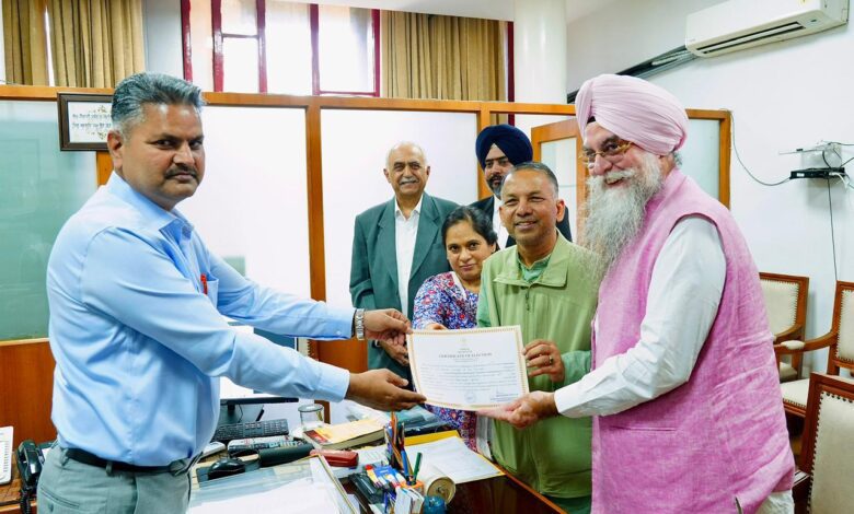 पंजाब विधानसभा के सचिव-कम-रिटर्निंग अधिकारी श्री राम लोक खटाना ने आज पंजाब राज्यसभा उम्मीदवार श्री रजिंदर गुप्ता, जो संसद के उच्च सदन के लिए निर्विरोध चुने गये थे, को चुनाव सर्टिफिकेट सौंपा। यह सर्टिफिकेट उन्हें पंजाब विधानसभा के स्पीकर श्री कुलतार सिंह संधवां की उपस्थिति में दिया गया। श्री रजिंदर गुप्ता के साथ उनकी पत्नी मधु गुप्ता भी मौजूद थीं।