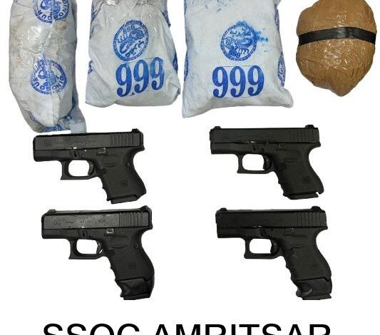 मुख्यमंत्री भगवंत सिंह मान के निर्देशानुसार त्योहारों के सीजन को सुरक्षित और शांतिपूर्ण बनाने के लिए चलाए जा रहे विशेष चेकिंग और विशेष अभियानों के दौरान बड़ी सफलता प्राप्त हुई है। स्टेट स्पेशल ऑपरेशन सेल (एसएसओसी) अमृतसर ने एक केंद्रीय एजेंसी के समन्वय में विदेशी हैंडलरों से जुड़े एक तस्करी नेटवर्क के पाँच सदस्यों को चार 9 मिमी कैलिबर ग्लॉक पिस्तौलों और 2 किलो हेरोइन सहित गिरफ्तार किया है। यह जानकारी पंजाब के पुलिस महानिदेशक (डीजीपी) गौरव यादव ने आज यहां दी।
