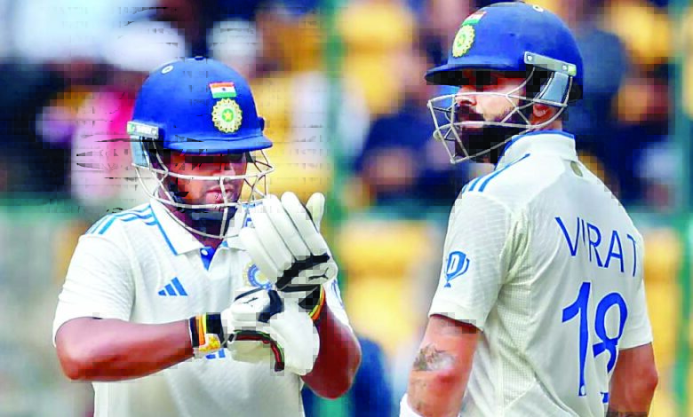 न्यूजीलैंड के खिलाफ भारत ने बंगलुरु टेस्ट की दूसरी पारी में वापसी कर ली है। शुक्रवार को तीसरे दिन का खेल खत्म होने तक टीम ने तीन विकेट के नुकसान पर 231 रन बना लिए हैं। भारत अभी न्यूजीलैंड से 125 रन पीछे है। सरफराज खान 70 रन नाबाद लौटे। विराट कोहली दिन की आखिरी गेंद पर आउट हो गए। उन्हें ग्लेन फिलिप्स ने विकेटकीपर टॉम ब्लंडेल के हाथों कैच कराया। कोहली 70, रोहित शर्मा 52 और यशस्वी जायसवाल 35 रन बनाकर आउट हुए। एजाज पटेल ने दो और ग्लेन फिलिप्स ने एक विकेट लिया। कोहली और सरफराज के बीच तीसरे विकेट के लिए 136 रन की साझेदारी हुई। न्यूजीलैंड की टीम पहली पारी में 402 रन पर ऑलआउट हो गई। टीम ने 356 रन की बढ़त हासिल की। तीन मैचों की सीरीज के पहले मैच के दूसरे दिन न्यूजीलैंड ने भारत को पहली पारी में 46 रन पर ऑलआउट कर दिया था।