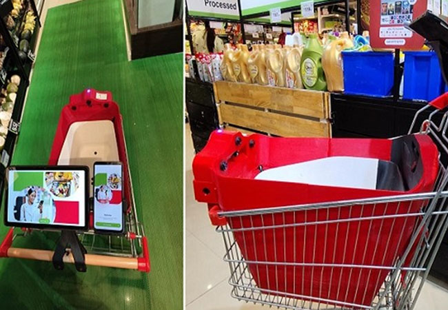 स्टोर में उपलब्ध इंटेलिजेंट शॉपिंग कार्ट सीधे बिलिंग डेस्क से जुड़ी होंगी। ग्राहक जो भी सामान कार्ट में डालेगा, उस सामान को कार्ट पर लगे आर्टिफिशियल इंटेलिजेंस से लैस कैमरे और स्कैनर कप्चर करके बिलिंग डेस्क को भेज देंगे और डेटा बेस से प्रोडक्ट का प्राइज निकाल कर बिल में जोड़ दिया जाएगा। गलती से शॉपिंग कार्ट में डाले गए प्रोडक्ट को अगर ग्राहक कार्ट से निकाल देता है तो उस प्रोडक्ट का प्राइस तुरंत बिल से स्वंय ही हट जाएगा। बिलिंग डेस्क ग्राहक की कार्ट का क्यूआर कोड स्कैन करेगा और आपका बिल पेमेंट के लिए तैयार हो जाएगा।