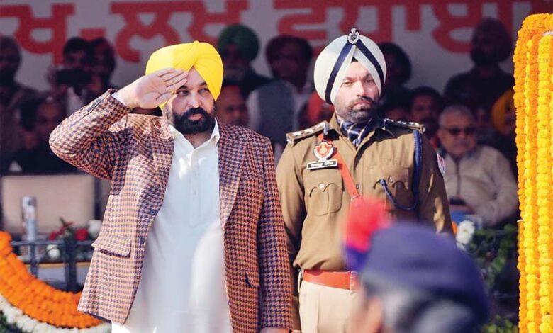 पंजाब के मुख्यमंत्री भगवंत सिंह मान ने दुश्मन ताकतों को मुंहतोड़ जवाब देने का संकल्प लेते हुए स्पष्ट शब्दों में कहा कि अमन-शांति सांप्रदायिक सद्भावना एकता और भाईचारे में विघ्न डालने के मंसूबे किसी भी कीमत पर सफ ल नहीं होने दिए जाएंगे। आज यहां पटियाला के पोलो ग्राउंड में 76वें गणतंत्र दिवस मौके समारोह दौरान राष्ट्रीय तिरंगा फ हराने के बाद सभा को संबोधित करते हुए मुख्यमंत्री ने कहा कि पंजाब गुरुओं,पीरों,फ कीरों,संतों,महापुरुषों और शहीदों की धरती है जो हमेशा भाईचारे और सांप्रदायिक सद्भावना की महान मूल्यों के लिए मानवता का मार्गदर्शन करती है।और उनकी सरकार किसी को भी शांति भंग करने की इजाजत नहीं देगी। भगवंत सिंह मान ने इस नेक कार्य के लिए लोगों का सहयोग मांगा ताकि राज्य की शांति तरक्की और खुशहाली को नुकसान पहुंचाने की साजिश रचने वाले दुश्मन को मुंहतोड़ जवाब दिया जा सके। मुख्यमंत्री ने फू ट डालने वाली ताकतों की निंदा करते हुए कहा कि उनके सांप्रदायिक विभाजन के मंसूबे किसी भी कीमत पर सफ ल नहीं होने देंगे।